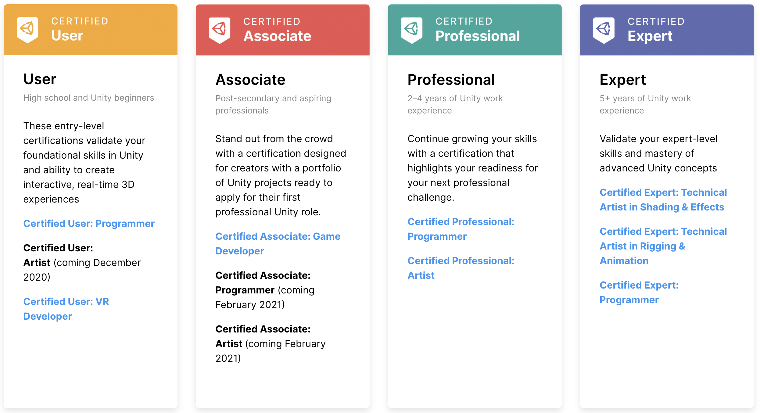 Unity 시험은 2021년 기준 크게 4종류로 돼있다.